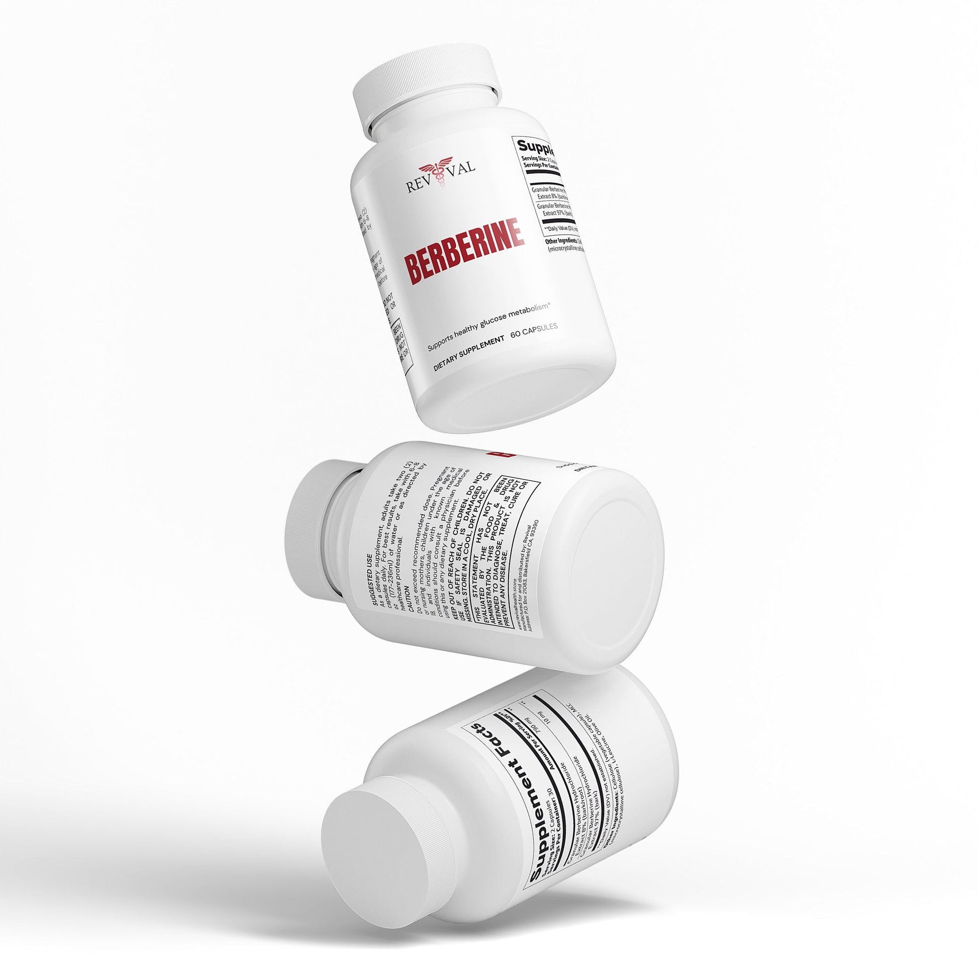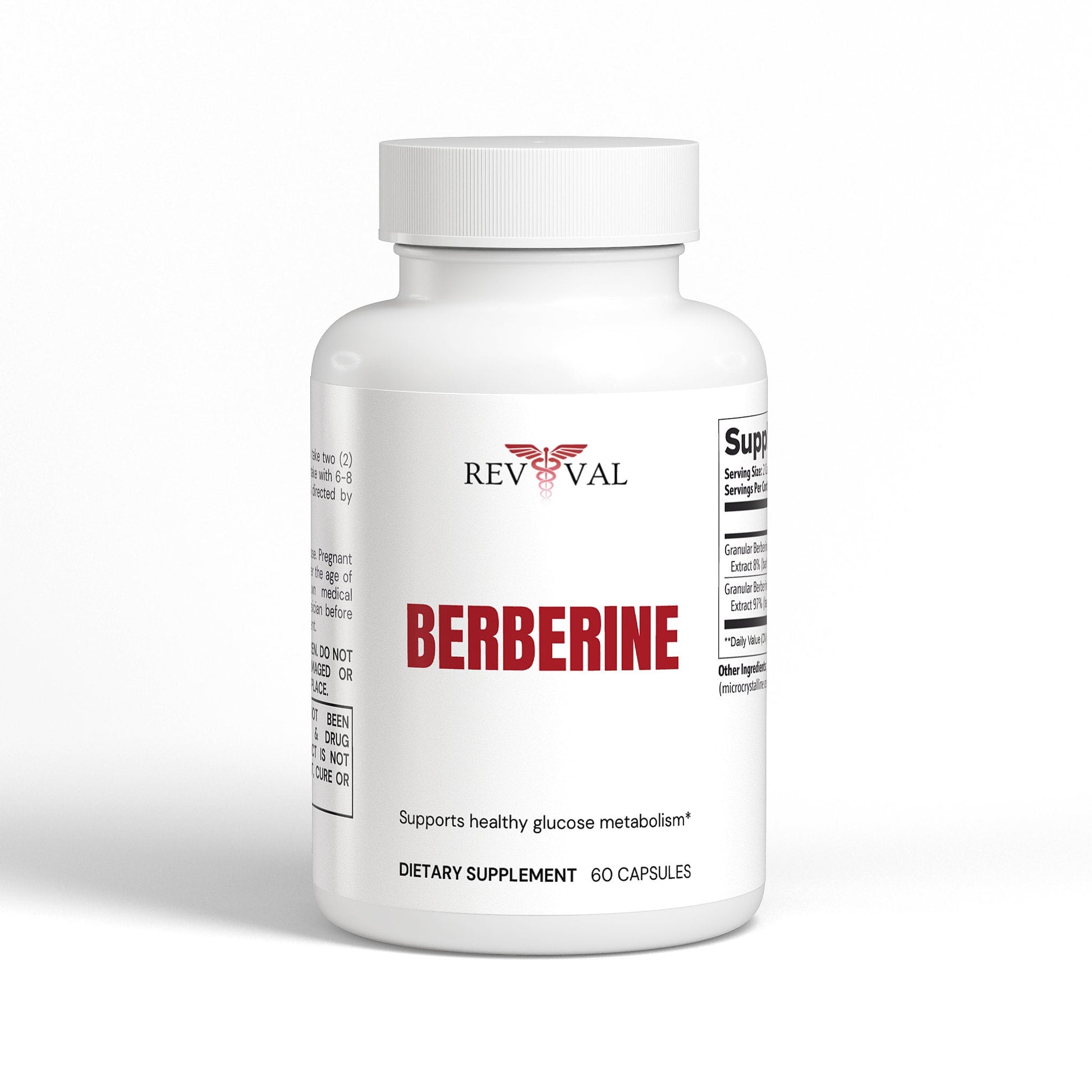 Ingredients: Granular Berberine Hydrochloride Extract 97% (bark), Granular Berberine Hydrochloride Extract 8% (bark/root), Cellulose (vegetable capsule), MCC (microcrystalline cellulose), L-Leucine, Olive Oil.