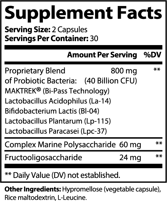 Ingredients: Proprietary Blend of Probiotic Bacteria: MAKTREK® (Bi-Pass Technology), Lactobacillus Acidophilus, Bifidobacterium Lactis, Lactobacillus Plantarum, Lactobacillus Paracasei, Marine Polysaccharide Complex, Fructooligosaccharide, Hypromellose (vegetable capsule), Rice maltodextrin, L-Leucine.