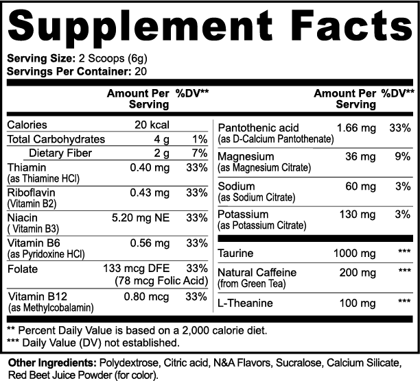 Ingredients: Thiamin (from Vitamin B1), Riboflavin (from Vitamin B2), Niacin (from Vitamin B3), Vitamin B6 (as Pyridoxal-5-phosphate), Folate (from Vitamin B9), Vitamin B12 (as Methylcobalamin), Pantothenic acid (from Vitamin B5), Calcium (from Calcium Ascorbate), Magnesium (from Magnesium Citrate), Sodium (from Sodium Citrate), Potassium (from Potassium Citrate), Taurine, Natural Caffeine (From Green Tea), L-theanine, Polydextrose, Citric acid, N&A Flavors, Sucralose, Calcium silicate, Fruit and Veggie blend (for color).